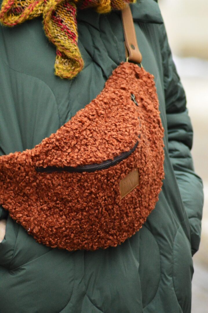 Nerka powstała z tkaniny tapicerskiej o fakturze baranka oraz skóry naturalnej . Nerka jest bardzo duża, więc nadaje się do noszenia tylko w formie torebki.