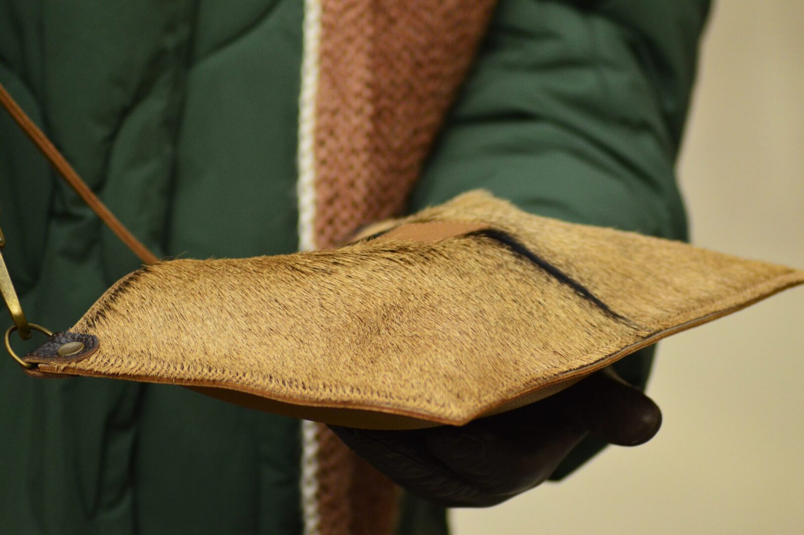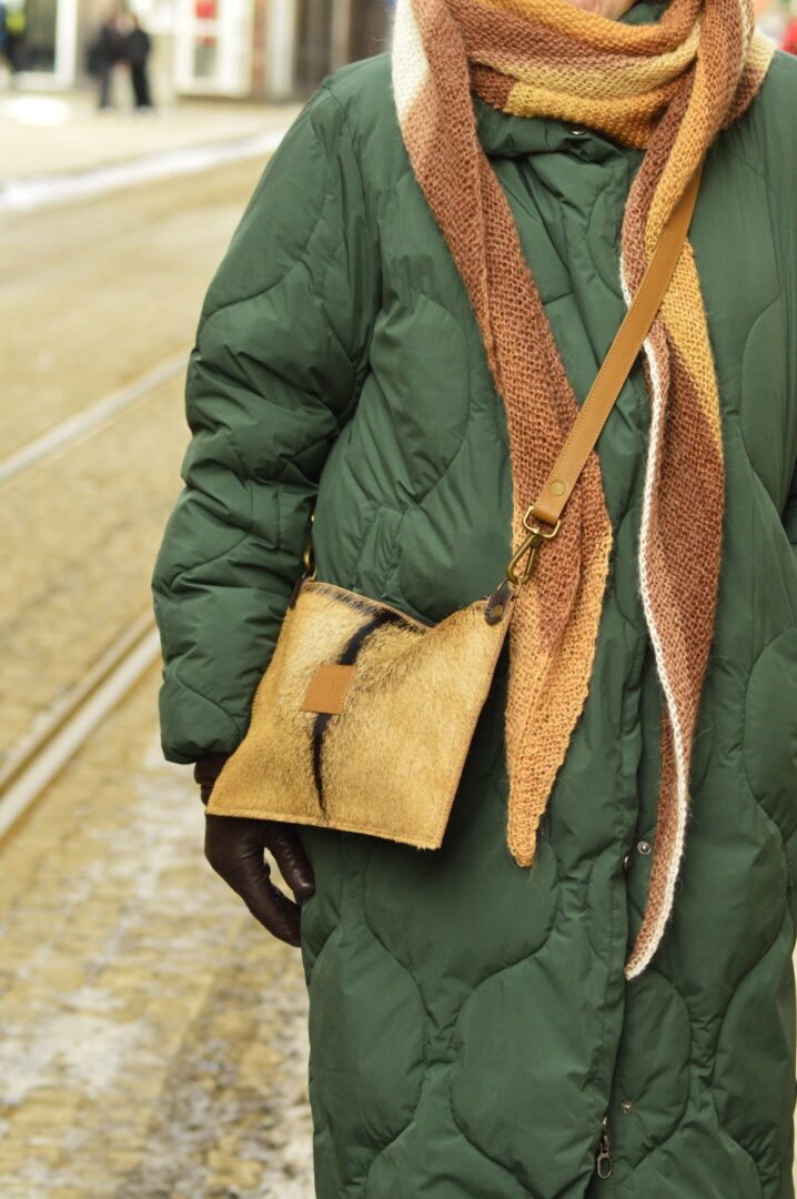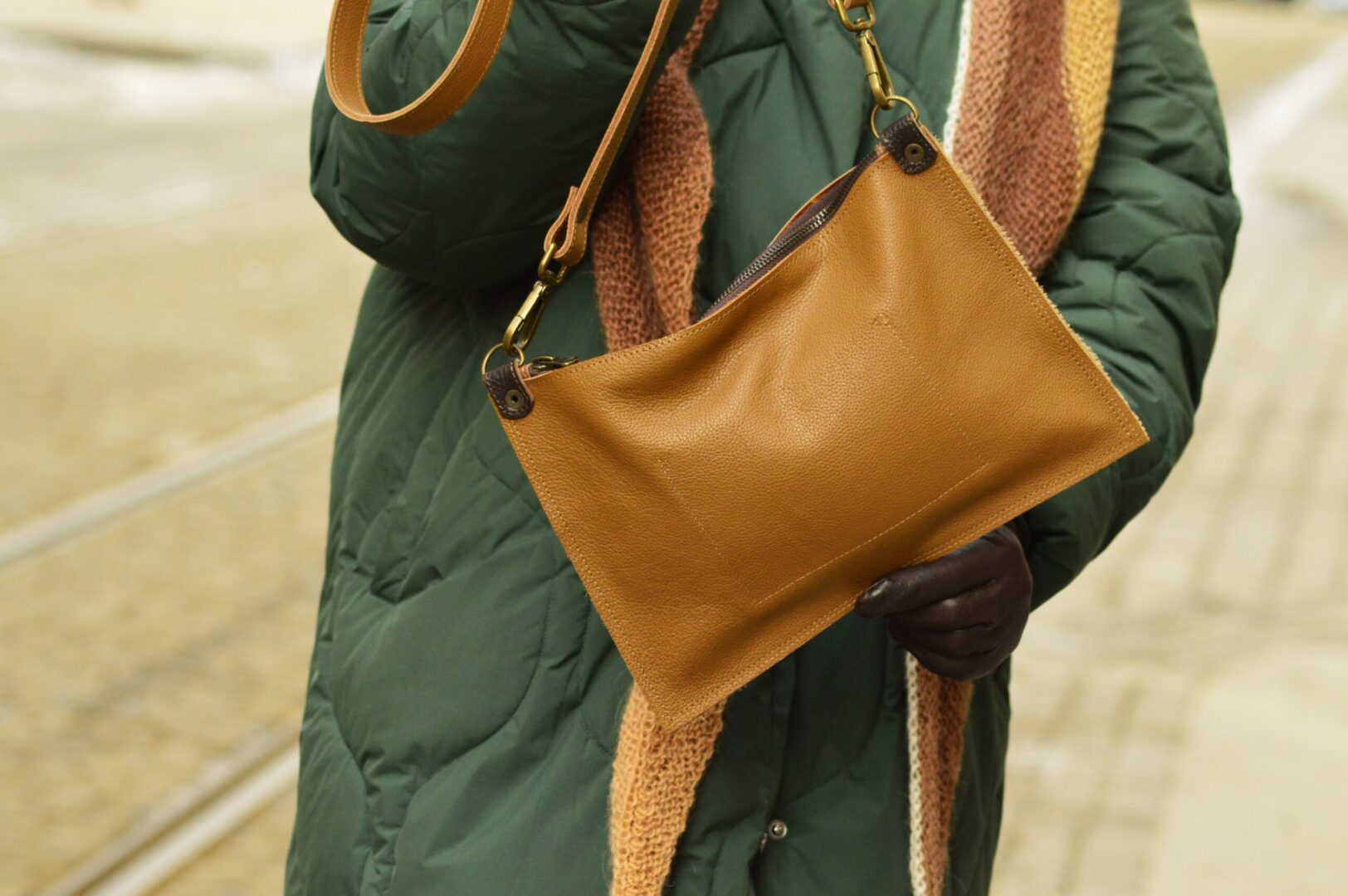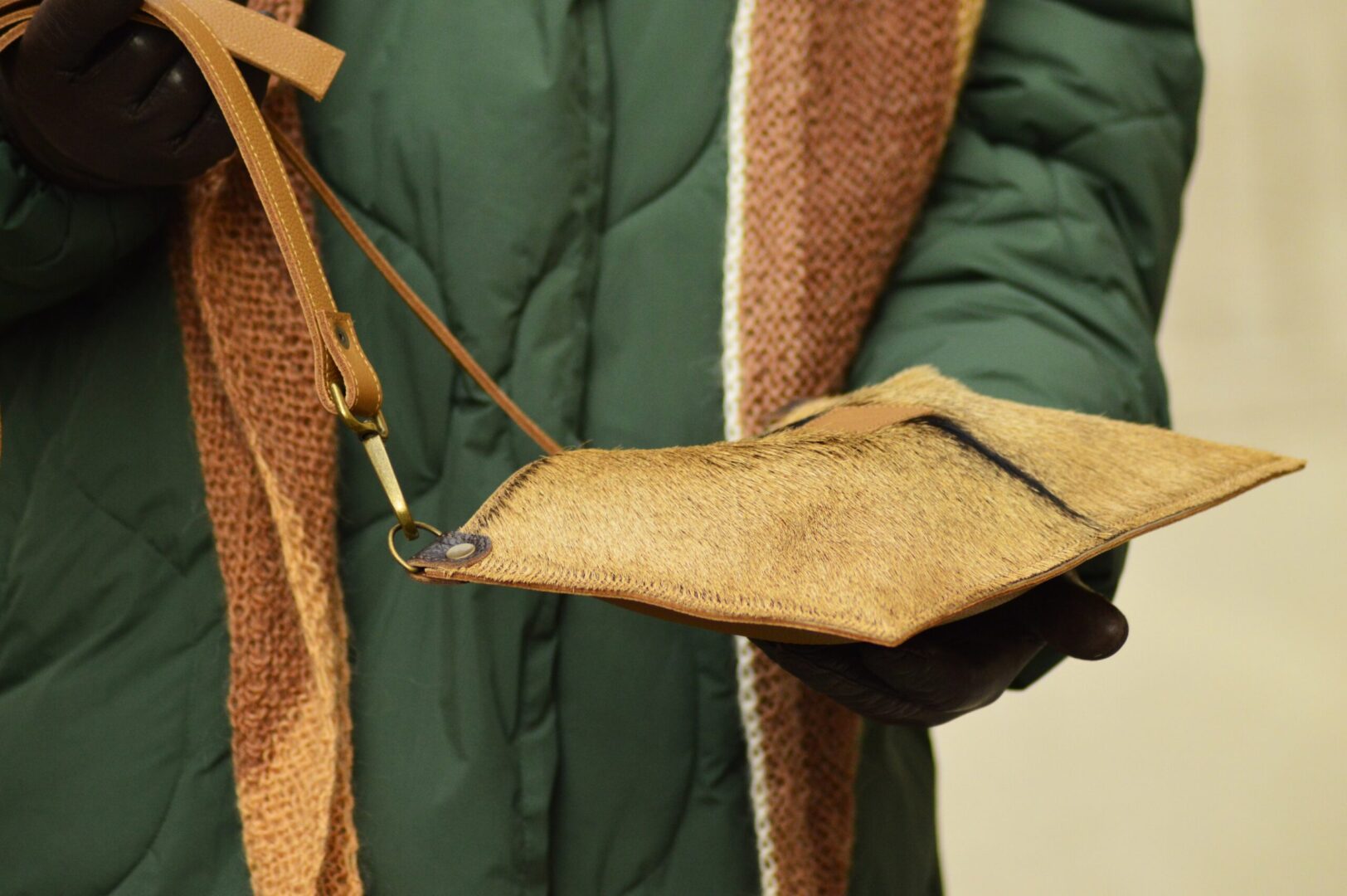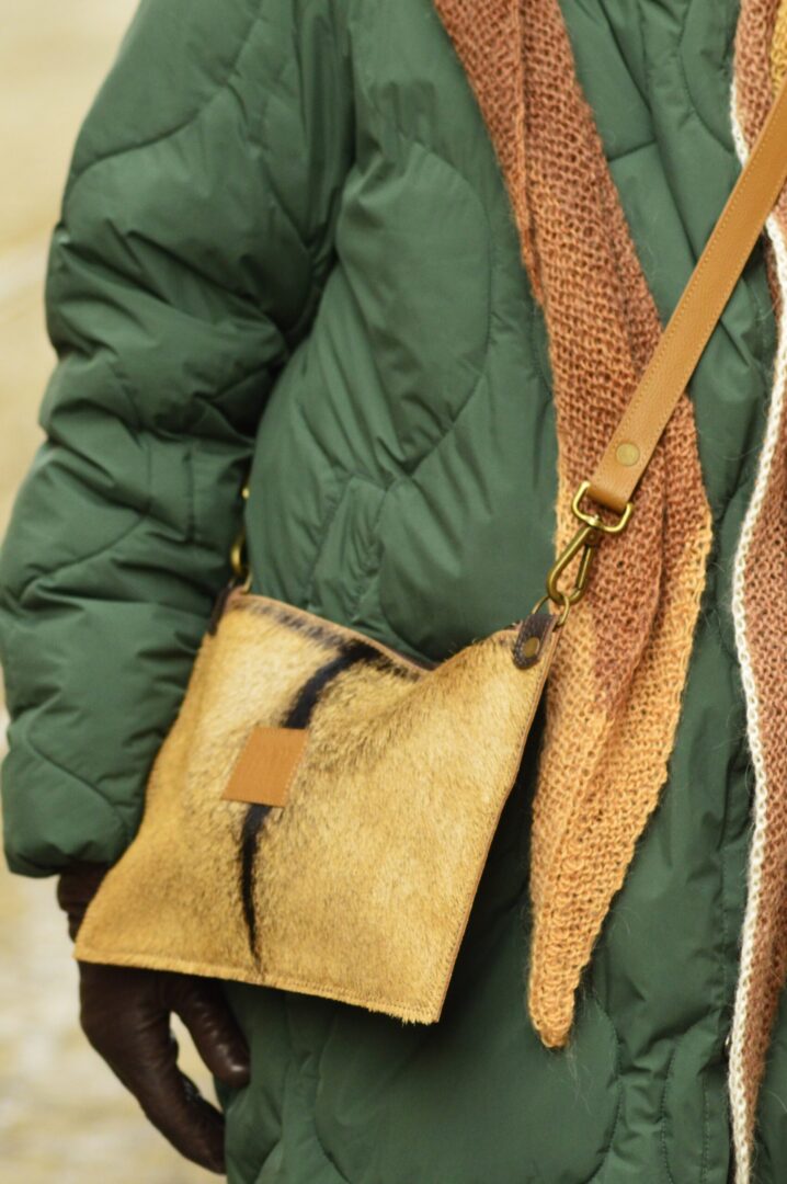 Minimalistycznie, ale z lekkim pazurek. Torebka powstała w całości ze skóry naturalnej. Połączenia skóry licowej w kolorze koniaku ( tył, regulowany pasek) oraz z włosiem ( przód torebki, włosie przy użytkowaniu może się trochę ścierać na krawędziach). Torebka zapina się na suwak, a wewnątrz znajduje się kieszonka ( torebka ma surowe wykończenie bez podszewki).