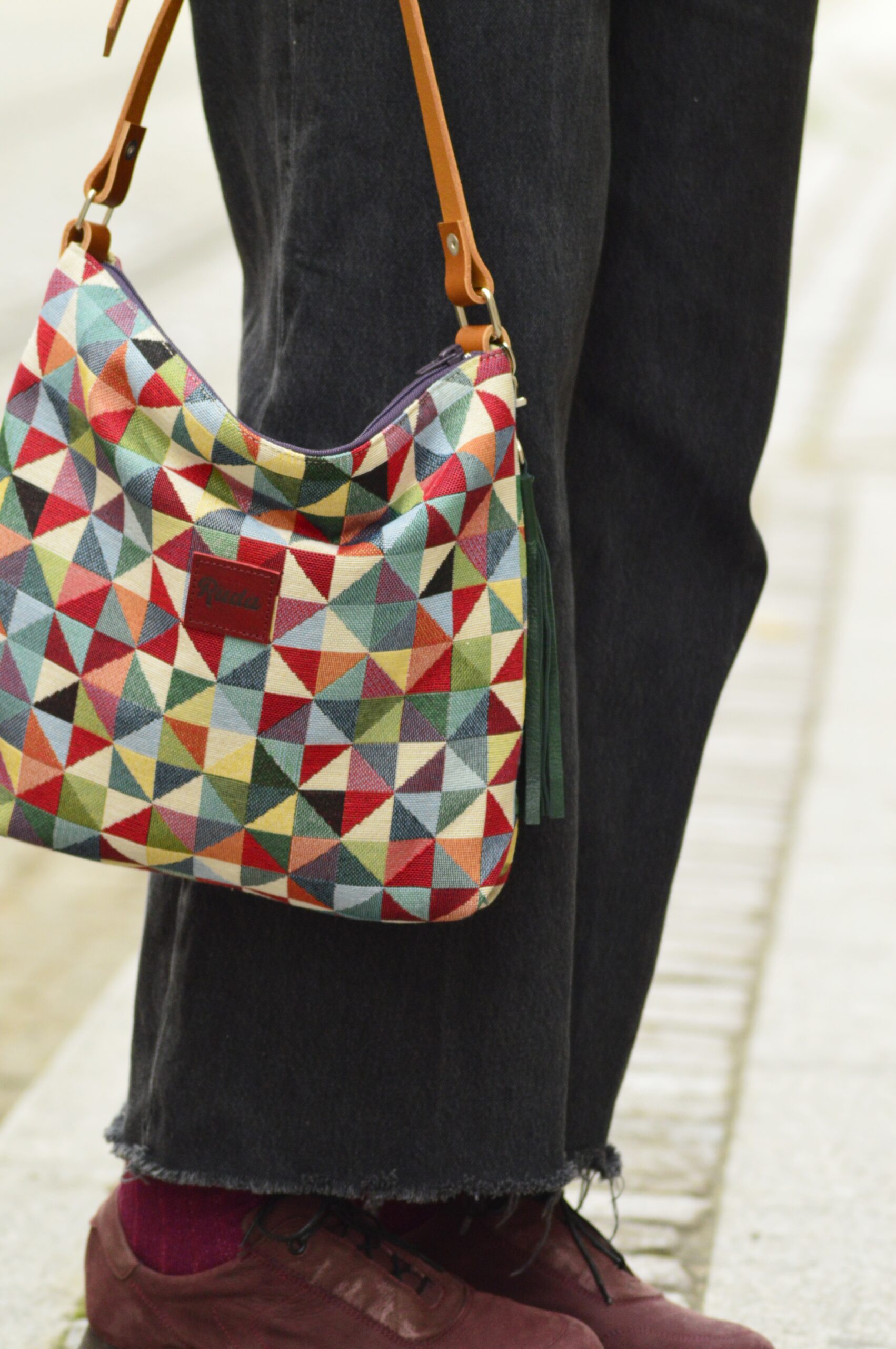 Torba powstała z gobelinu oraz skóry naturalnej (regulowany pasek, łączenia oraz chwost). Dodatkowo torebeczka jest wzmocniona warstwą wodoodporną. Torba zapina się na suwak, a wewnątrz znajduje się mała kieszonka na suwak. Skórzany pasek posiada regulację na klamrę.