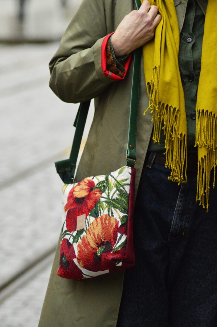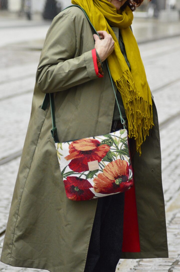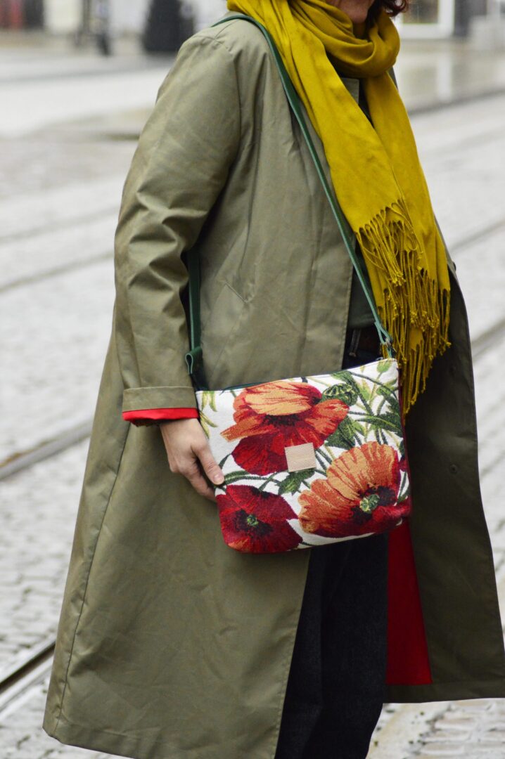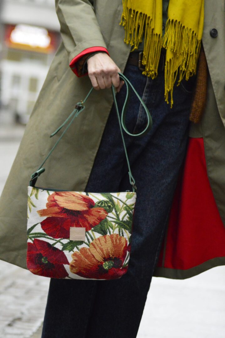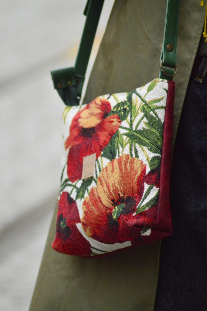 Torba powstała z gobelinowej z makowym wzorek, tkaniny tapicerskiej ( bodowy tył) oraz skóry naturalnej (regulowany pasek, łączenia). Dodatkowo torebka jest wzmocniona warstwą wodoodporną. Torba zapina się na suwak, a wewnątrz znajduje się kieszonka. Skórzany pasek posiada regulację na klamrę.
