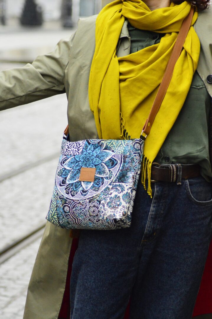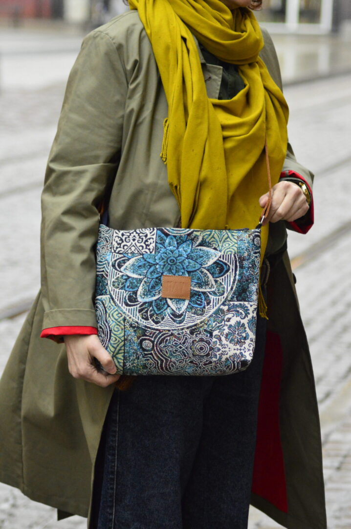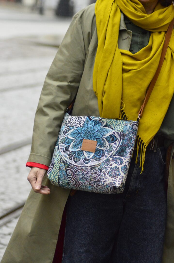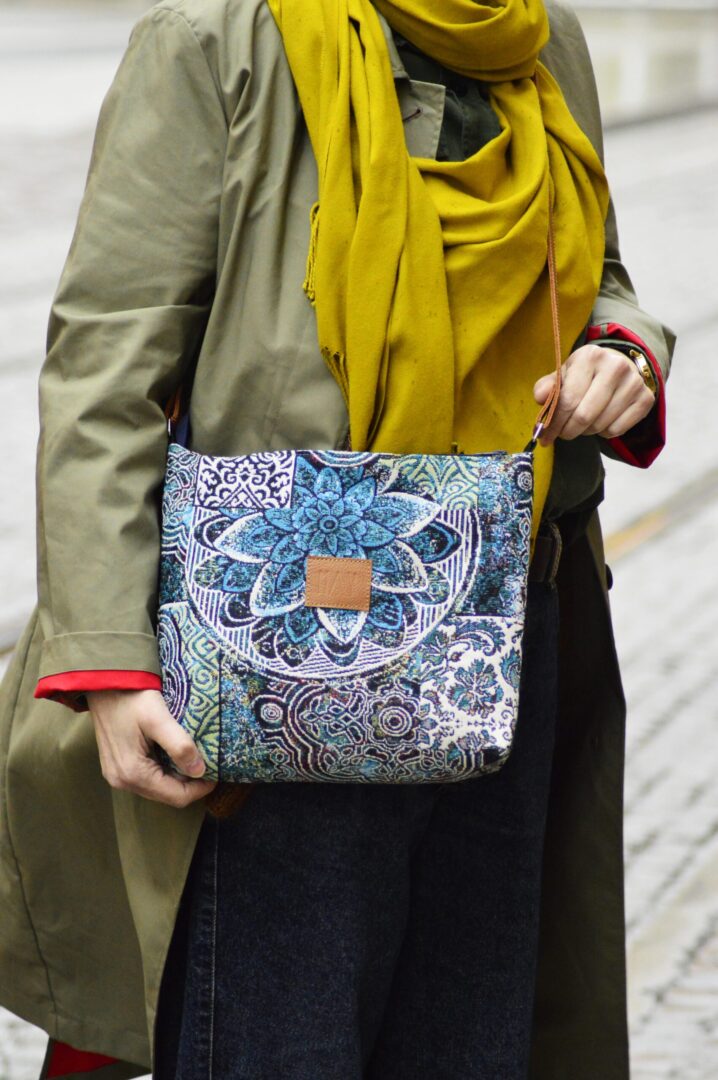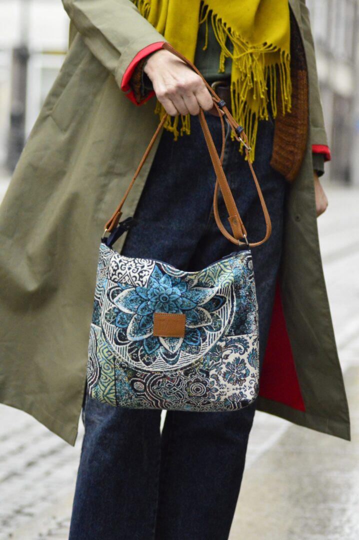 Torba powstała z  gobelinowej  w orientalnym wzorze oraz skóry naturalnej (regulowany pasek, łączenia). Dodatkowo torebka jest wzmocniona warstwą wodoodporną. Torba zapina się na suwak, a wewnątrz znajduje się trzy kieszonka. Skórzany pasek posiada regulację na klamrę. Z tyłu na zewnątrz znajduje się dodatkowa kieszonka.