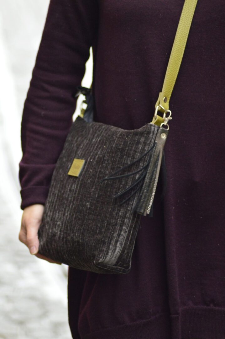 Torba powstała z tapicerskiego sztruksu w kolorze grafitowym oraz zielonej skóry naturalnej (regulowany pasek, łączenia). Dodatkowo torebeczka jest wzmocniona warstwą wodoodporną.Torba zapina się na suwak, a wewnątrz znajduje się mała kieszonka na suwak. Skórzany pasek posiada regulację na klamrę.