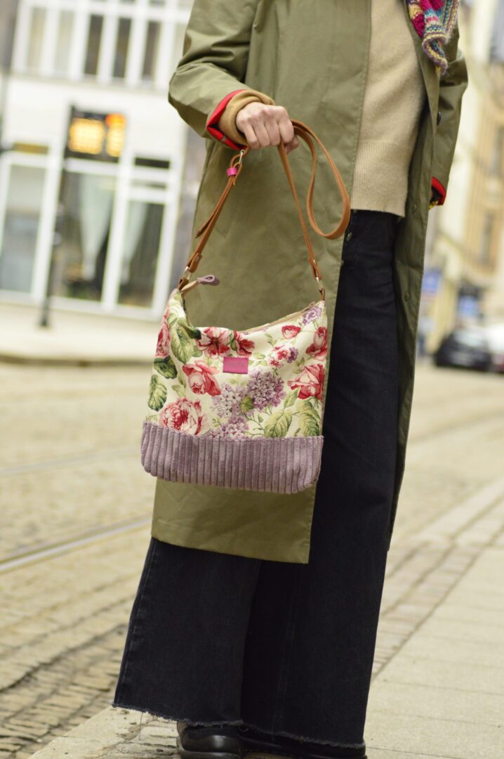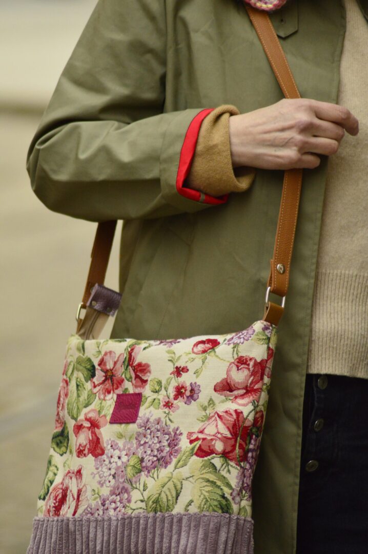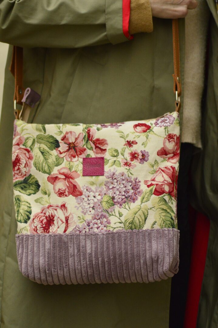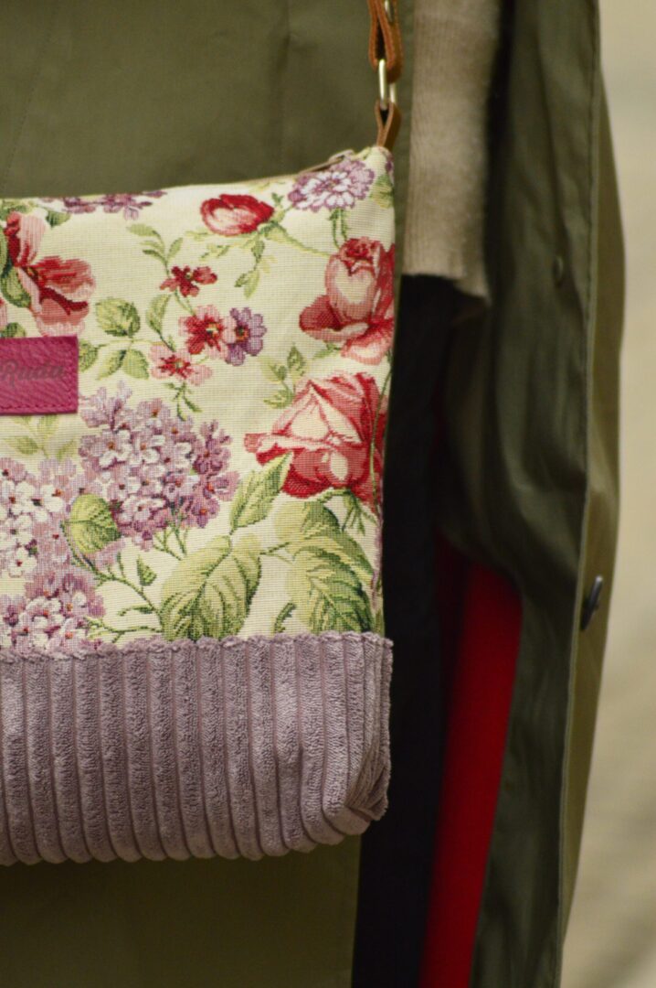 Torba powstała z tkaniny tapicerskiej ( sztruks na dole), gobelinowej ( wzór kwiatów) oraz skóry naturalnej (regulowany pasek, łączenia). Dodatkowo torebka jest wzmocniona warstwą wodoodporną. Torba zapina się na suwak, a wewnątrz znajduje się trzy kieszonka. Skórzany pasek posiada regulację na klamrę.