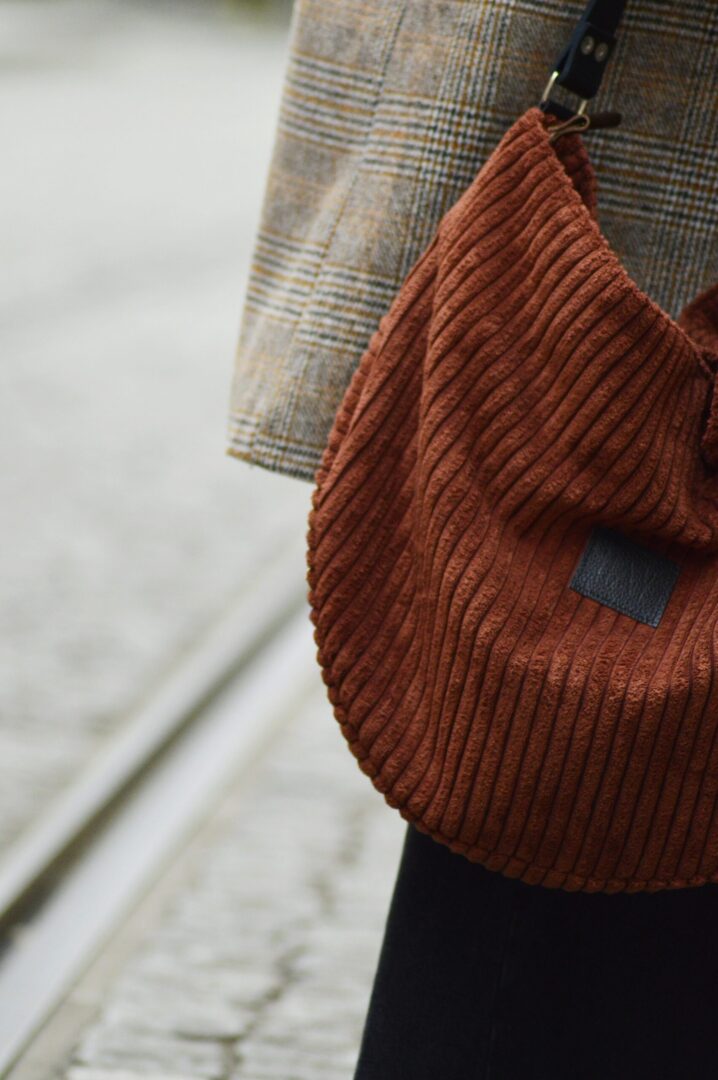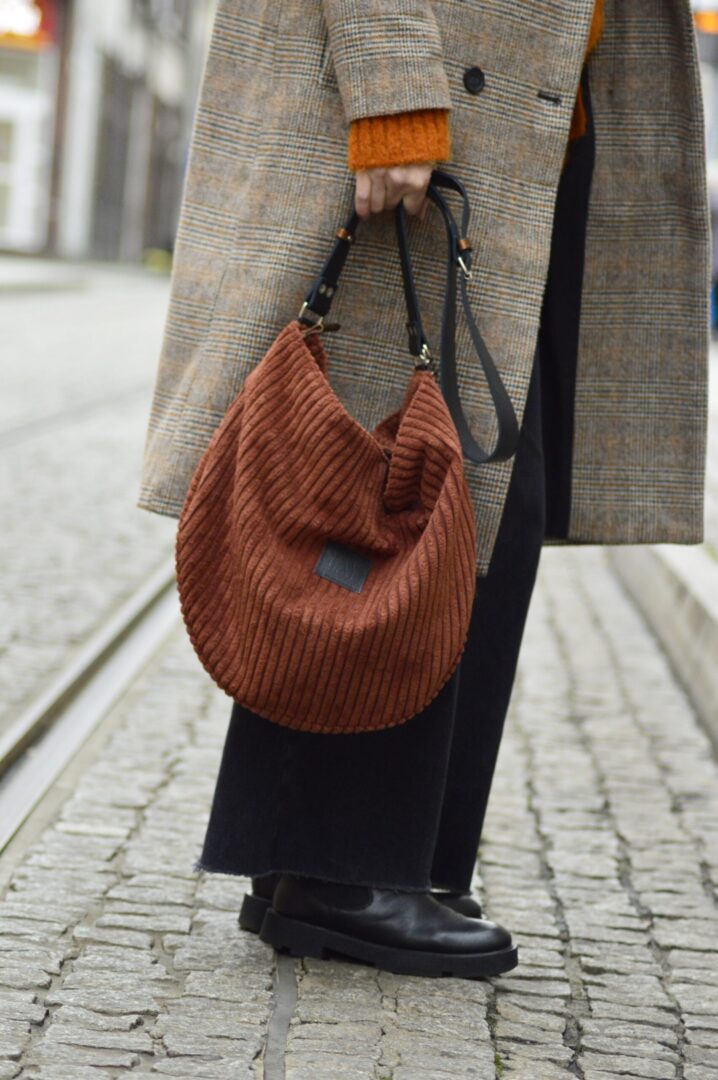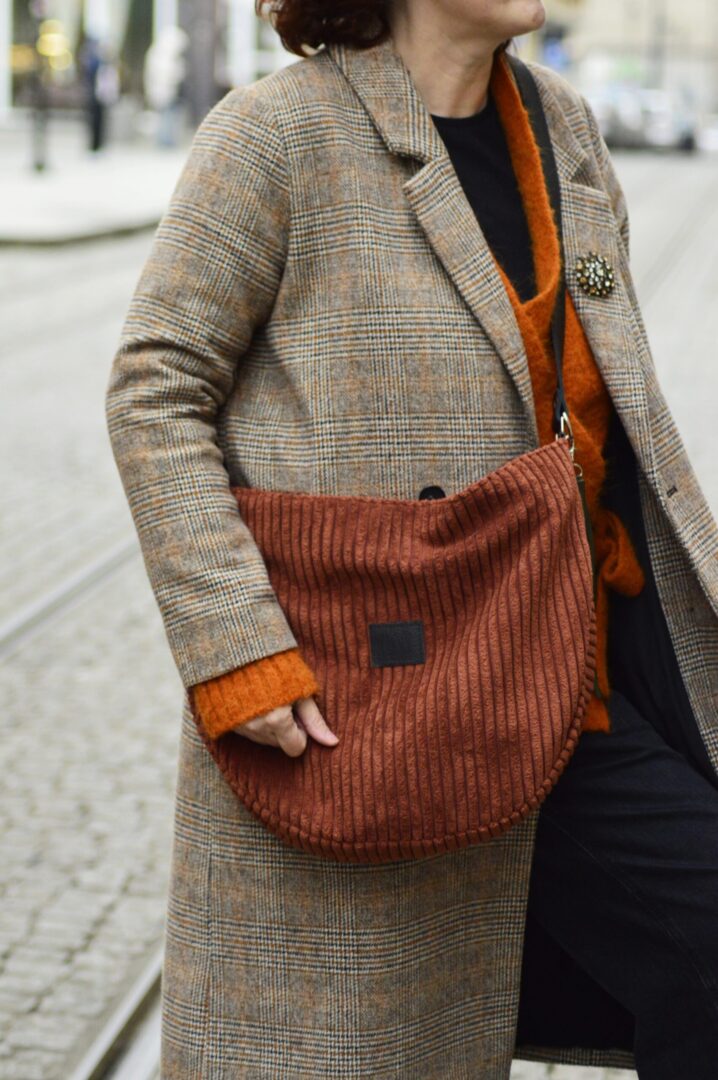 Pojemna i wygodna torba wykonana z tkaniny tapicerskiej sztruksowej oraz skóry w kolorze czarnym (pasek).