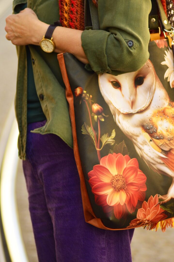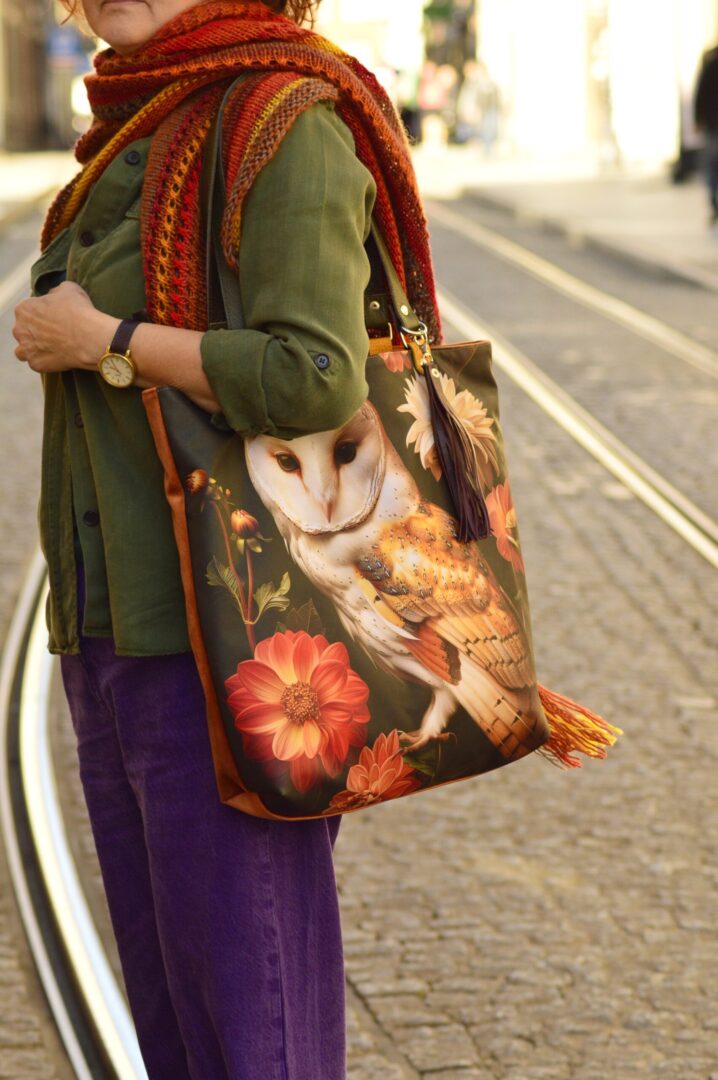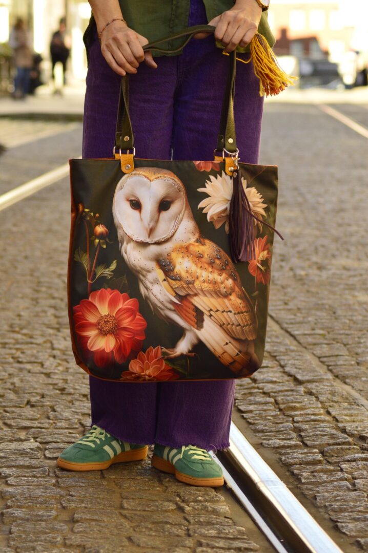 Torba powstała z mocnej tkaniny obiciowej o fakturze weluru, wydruku na poliestrze ( sowa) oraz skóry naturalnej ( łączenia ,rączki oraz chwost). Całość jest dodatkowo wzmocniona materiałem wodoodpornym. Torba zapina się na suwak, a wewnątrz znajdują się trzy kieszonki ( w tym jedna na suwak).