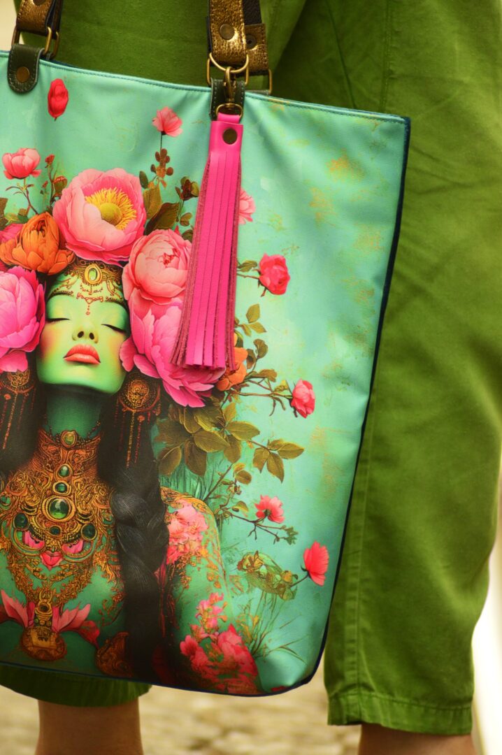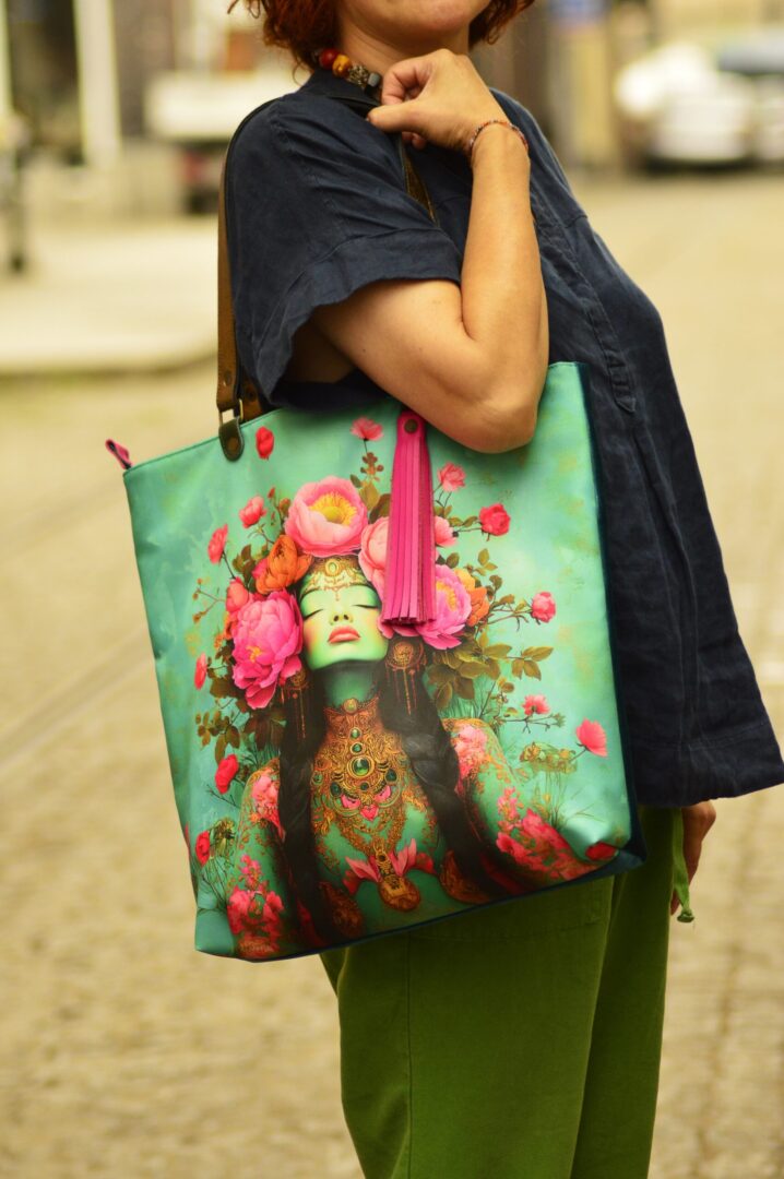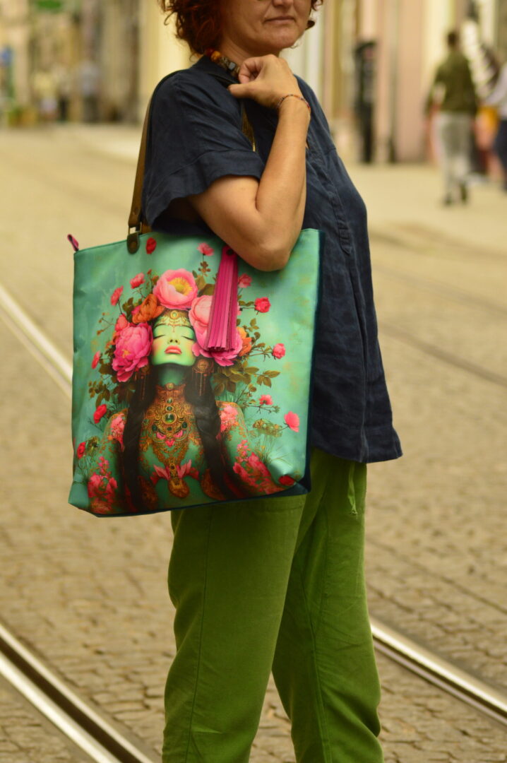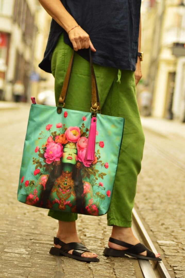 Torba powstała z mocnej tkaniny obiciowej o fakturze weluru, wydruku na poliestrze oraz skóry naturalnej ( łączenia ,rączki oraz chwost). Całość jest dodatkowo wzmocniona materiałem wodoodpornym. Torba zapina się na suwak, a wewnątrz znajdują się trzy kieszonki ( w tym jedna na suwak).